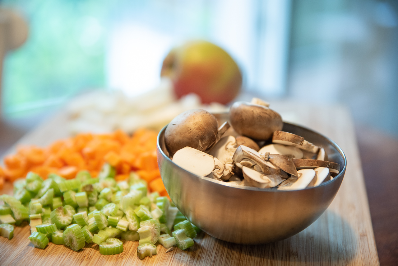 Das Olivenöl bei mittlerer Hitze in einer großen Pfanne erhitzen und Zwiebel, Sellerie sowie Karotten darin 5 Minuten anbraten, bis sie weich werden. Knoblauch und Pilze hinzufügen und weitere 3 Minuten braten. Das Hühnerfleisch und den Oregano in die Pfanne geben und weitere 10 Minuten braten, bis das Fleisch gar und außen leicht angebräunt ist.