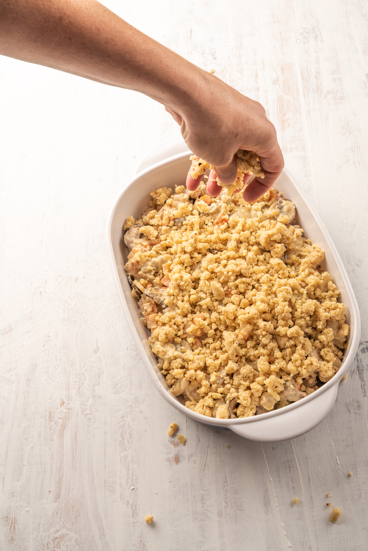 Den Auflauf mit dem Crumble bedecken und im Ofen 25 Minuten backen, bis der Crumble goldbraun und knusprig wird.