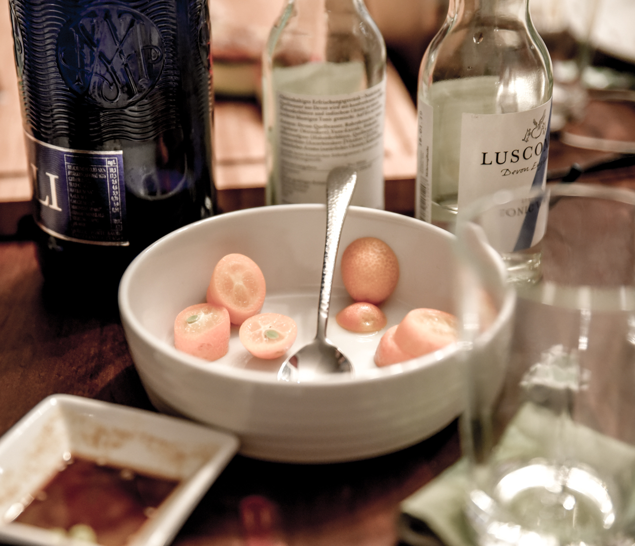 Nun wenn wir schon ein japanisches Gin Tasting bei omoxx veranstalten, dann sollte auch das Umfeld stimmen. Dieses haben wir, zumindest essenstechnisch, versucht zu schaffen – mit Hähnchenspießen japanischer Art (Yakitori) und Sushi. Bei den Yakitori hat sich unser Küchenchef Thomas wieder selber übertroffen, weil er ihnen, wie könnte es anders sein, mit der Kombination von Kumquats, seinen persönlichen Touch gegeben hat. Das Sushi war allerdings dann nicht mehr "homemade". Es kam von einem Sushi-Lieferservice, von dem ich glaube, dass dieser einer der besten, wenn nicht sogar der beste, in München ist. Ich finde generell, dass Sushi sehr gut zu Gin passt und selbst das Pairing mit einem Gin Tonic sollte jeder Gin-Enthusiast einmal probiert haben – sofern er denn Sushi mag. Darüber hinaus haben wir mit unserem Signature Cocktail "Lost in Translation" gleich einmal bei unserer Tasting-Gemeinschaft einen "japanischen Gin Akzent" gesetzt. Apropos Tasting-Gemeinschaft: Es war wieder toll, mit so einer bunte Runde aus Bloggern, Spirit-Experten, Freunden und Gin-Connaisseuren an einem Tisch zu sitzen, sich auszutauschen und Gin zu probieren. Vielen Dank für eure tolle Unterstützung! Besonderen Dank möchten wir Jürgen Liebenau von www.jwhisky.de zukommen lassen, der uns einen Großteil der verkosteten japanischen Gins unentgeltlich zur Verfügung gestellt hat. In seinem Online-Shop (www.japan-gin.com) finden sich mittlerweile mehr als zehn japanische Gins. Wenn ihr also mal auf der Suche nach einem besonderen Gin seid, solltet ihr hier unbedingt mal vorbeischauen. Darüber hinaus möchten wir uns auch ganz herzlich bei Luscombe Deutschland bedanken, die uns freundlicherweise mit "einigen" Flaschen von ihren drei verschiedenen Sorten ihres echt tollen Tonic Waters unterstützt haben. Ich finde, dass das Luscombe Tonic sehr gut mit den meisten von uns verkosteten Japanischen Gins harmoniert hat.
