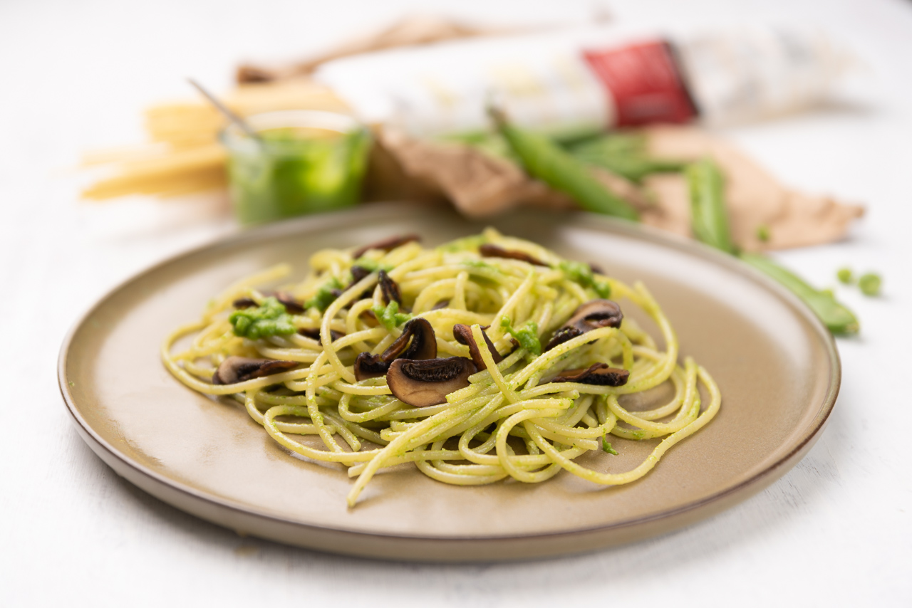 Nudeln mit Erbsenpesto und Champignons