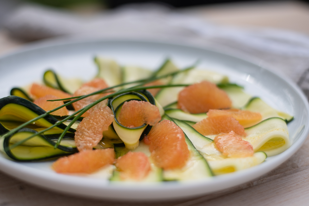 - Das überschüssige Salz von den Zucchinistreifen abspülen. Mit den Grapfruitfilets mischen und mit einem kräftigen Schuss Olivenöl marinieren. Etwas von dem Grapfruitsaft dazugeben. Fertig.