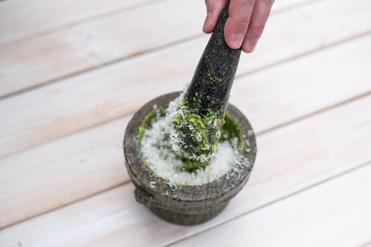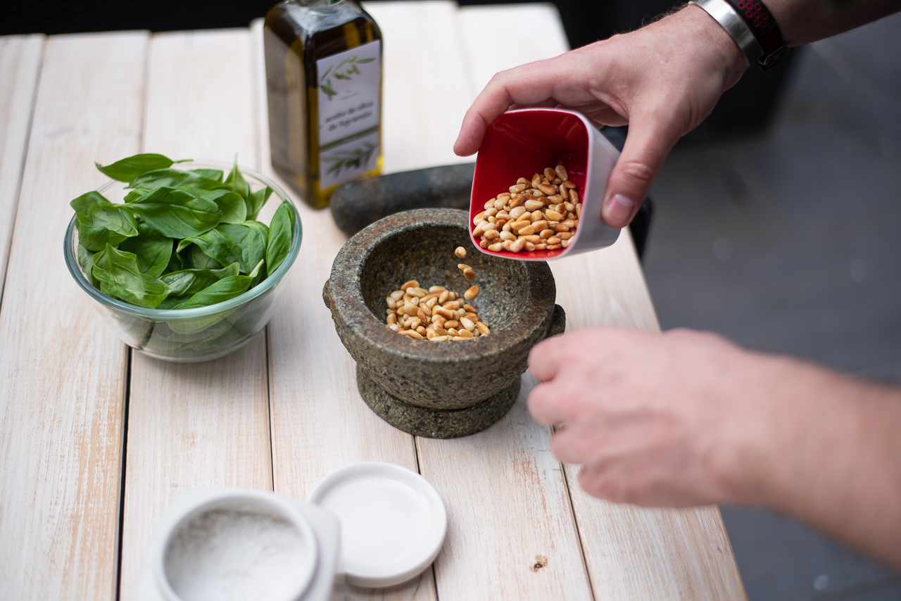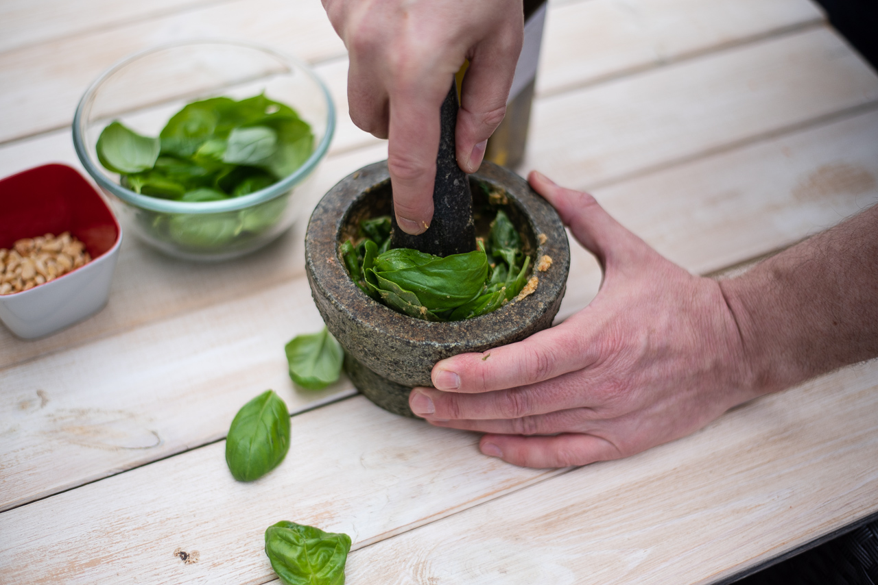 - Die Pinienkerne in einer kleinen Pfanne auf mittlerer Hitze (ohne Öl!) leicht anrösten bis sie eine leicht goldene Farbe haben. Denkt daran, dass die Pinienkerne in der heißen Pfanne auch dann noch nachrösten, wenn ihr den Herd schon ausgeschaltet habt. Pinienkerne ca. 30 Minuten abkühlen lassen. Parmesankäse reiben. Die Knoblauchzehe schälen und in kleine Stücke schneiden. Die abgekühlten Pinienkerne in einen größeren Steinmörser geben und vorsichtig klein stampfen bis eine gleichmäßige Masse entstanden ist. Jetzt die Knoblauchzehenstücke und ein Teil der Basilikumblätter hinzugeben und weiter langsam aber beständig mörsern. Abwechselnd ein Teil des Salzes und weitere Basilikumblätter hinzugeben und dabei immer weiter mörsern. Wenn die Basilikumblätter nicht vollständig zerkleinert werden ist das nicht tragisch, wichtig ist vor allem, dass sie durch das Mörsern ihr ganzes Aroma freisetzten. Nach und nach das Olivenöl dazu gießen und auch hier weiter mörsern. Zum Schluss den Parmigiano Reggiano (Ihr könnt natürlich auch Grana Padano nehmen) zu der Masse geben und vorsichtig unterrühren. Fertig ist ein sensationelles Pesto.