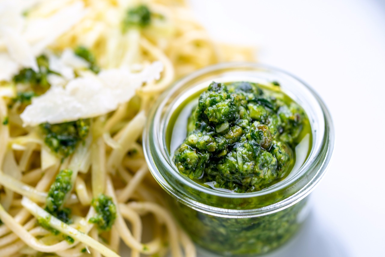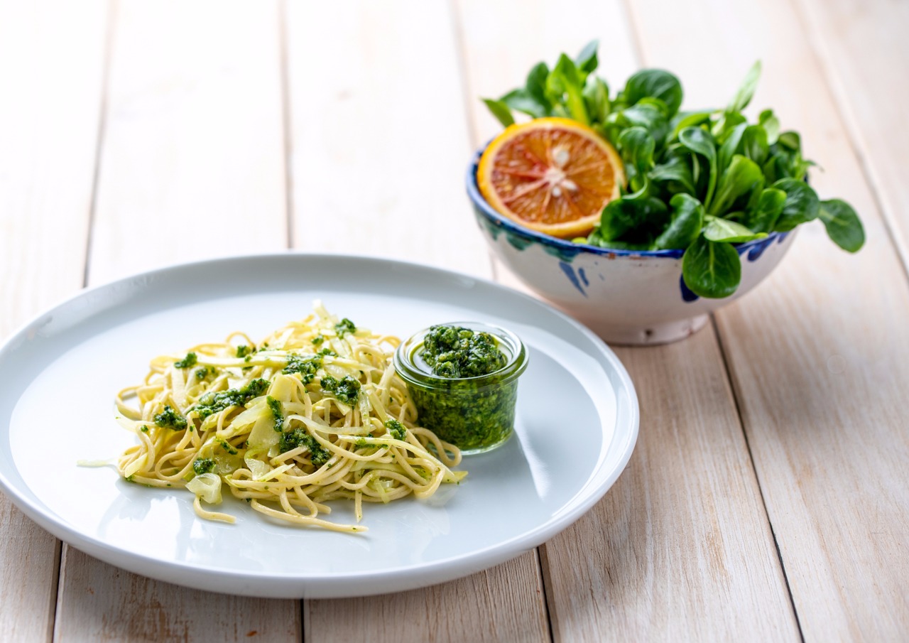 - Die Nudeln unter das Gemüse mischen und mit Feldsalat-Pistazien-Pesto servieren (wahlweise dieses auch sofort mit dem Gemüse und den Nudeln mischen)