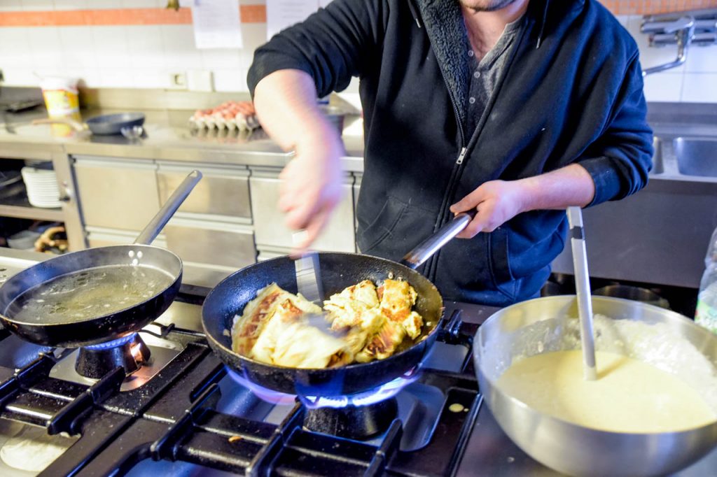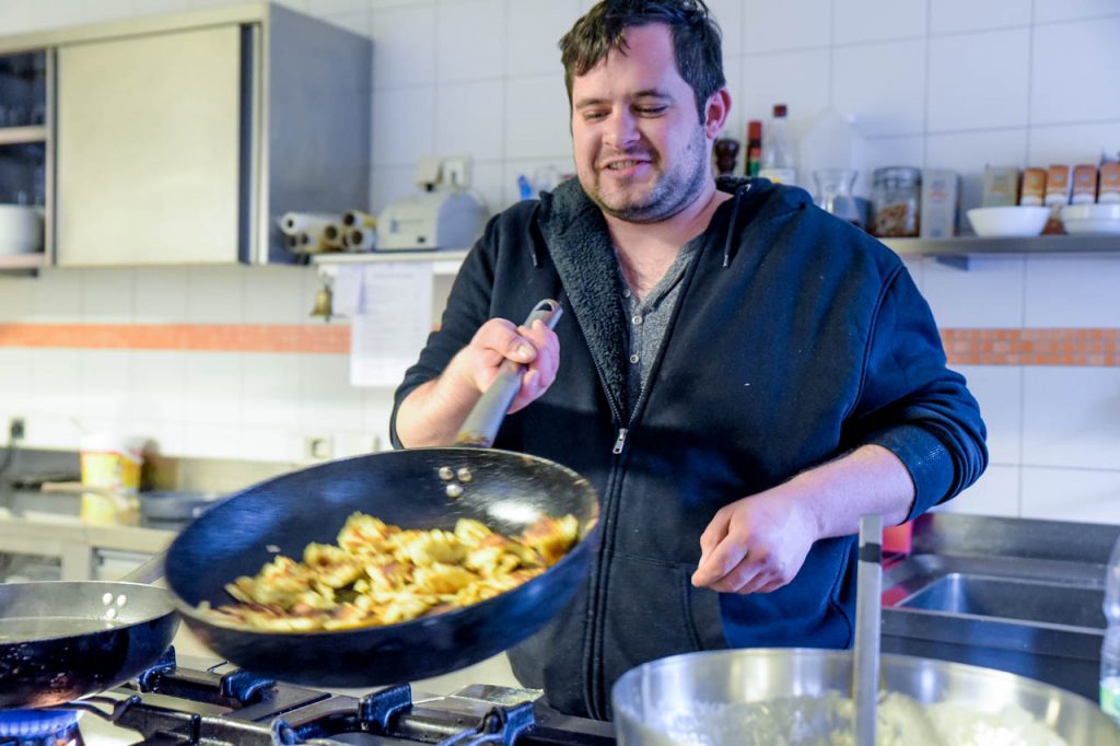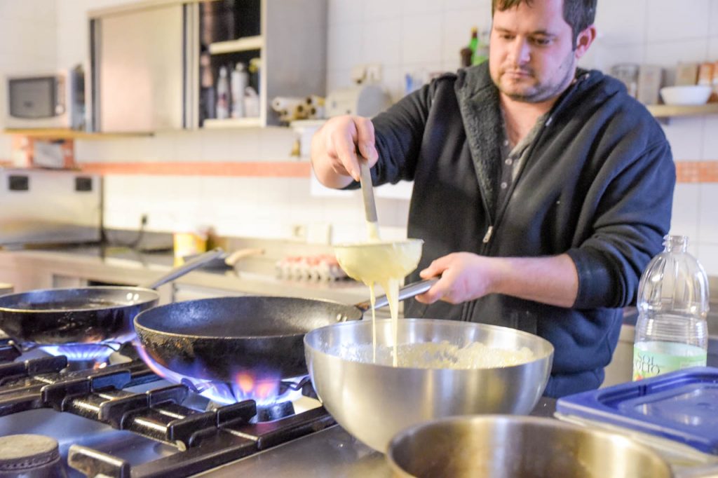 Zurück auf dem Hof gönne ich mir dann noch eine große Portion Kaiserschmarren. Manuell nimmt Mehl und Milch und rührt daraus einen Teig. Ein Rezept gibt es nicht, er macht das nach Augenmaß. Wichtig ist nur, dass die Eier erst am Schluss vorsichtig untergerührt werden, dadurch geht der Kaiserschmarren besser auf. Ich habe also wieder was gelernt.