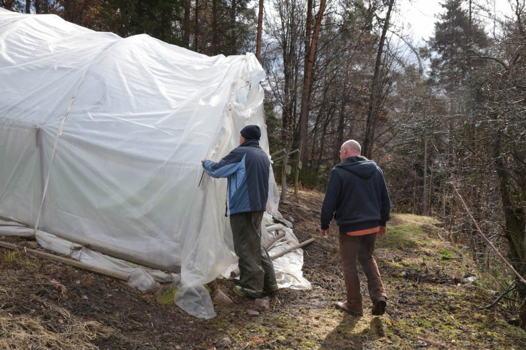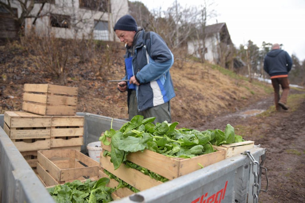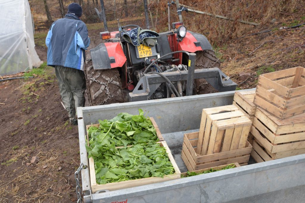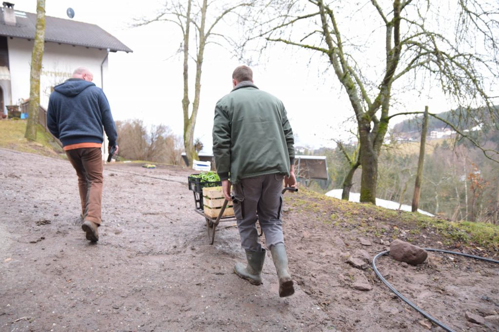 Bei meinem Besuch in der Gärtnerei ist die Auswahl jahreszeitlich bedingt noch überschaubar, aber das ist Ende März ganz normal. Gerade sind sie dabei frischen Spinat zu ernten und auch der Meerrettich wird gerade gestochen, der wird hier traditionell an Ostern zum Osterschinken gereicht. Vollbeladen mit frischen Gemüse geht es zurück ins Edelweiss.