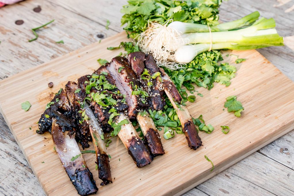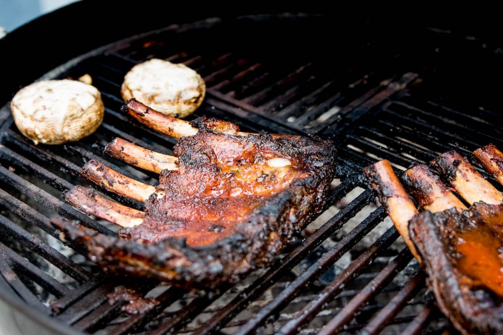 - Nach 2 Stunden die Rippchen mit der Glasur bepinseln und auf dem Grill bei indirekter Hitze für ca. 30 Minuten grillen.