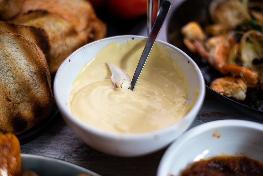Zum Testen hab ich 5 Rezepte und die Aioli aus dem Buch ausprobiert (Röstbrot mit Knoblauch und Tomate, Frittierte Meeresfrüchte, Knoblauchgarnelen, Spanisches Spiegelei und ein maurisches Hühnchen mit Chili-Knoblauch-Sauce).