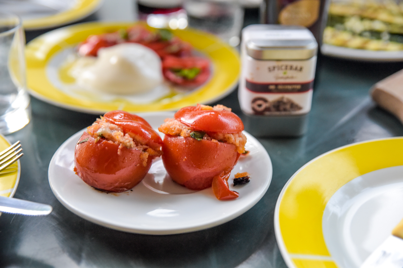 Die Tomaten hab ich ausgehöhlt, das Fruchtfleisch gehackt und zusammen mit fein geschnittenem alten Brot (Semmelbrösel sucht man hier vergeblich), Knoblauch, Parmesan und Olivenöl, wieder eingefüllt.