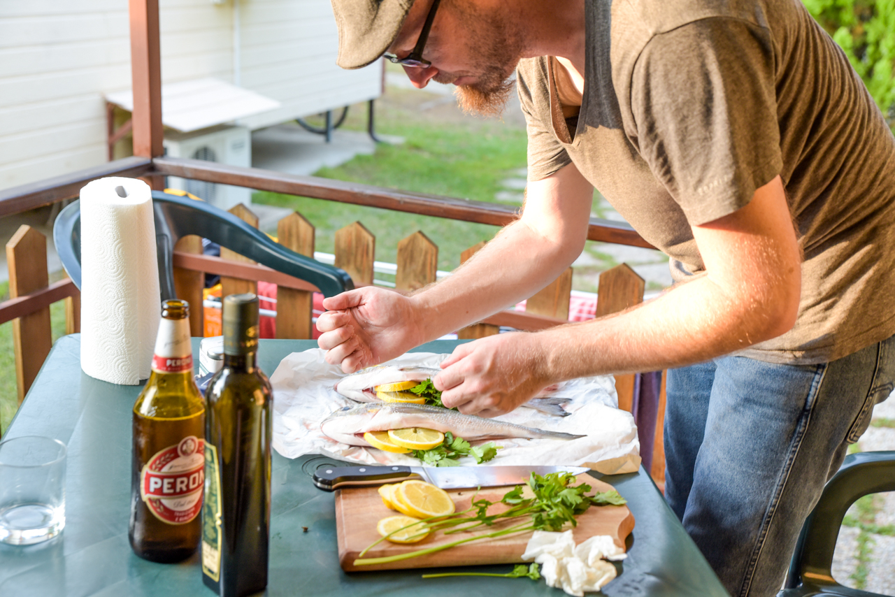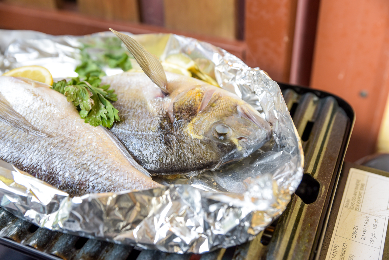 Der Zweite Test ist Fisch. Ich habe mir zwei wunderschöne Doraden besorgt. Die Fischverkäuferin im Ort hat sie mir zum Glück noch ausgenommen und geschuppt. Das hab ich selber noch nie gemacht – keine Ahnung, ob ich das hinbekommen würde.