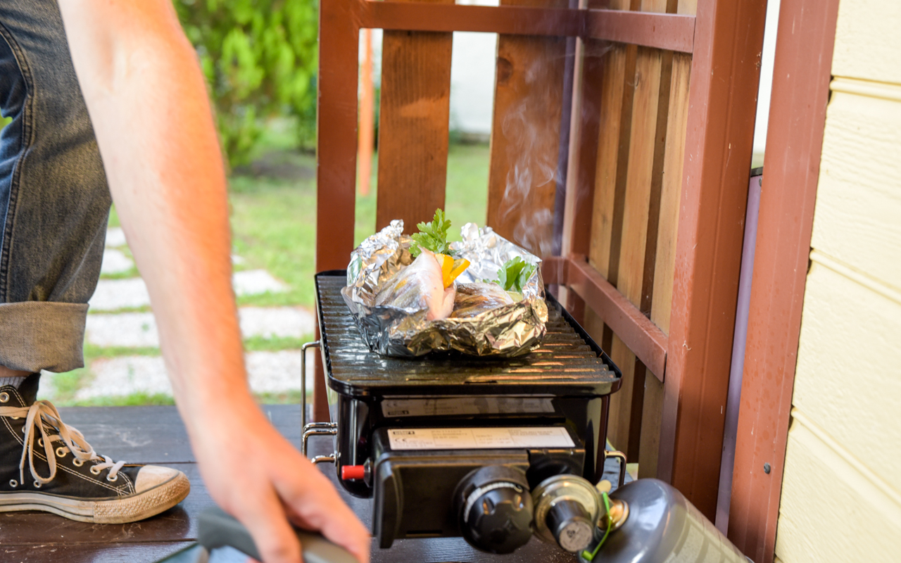 Wer den Grill zu Hause einsetzen will, sollte sich ein Umrüst-Set besorgen und den Grill an eine große 5kg Gasflasche anzuschließen. Damit kann man viel Geld sparen.