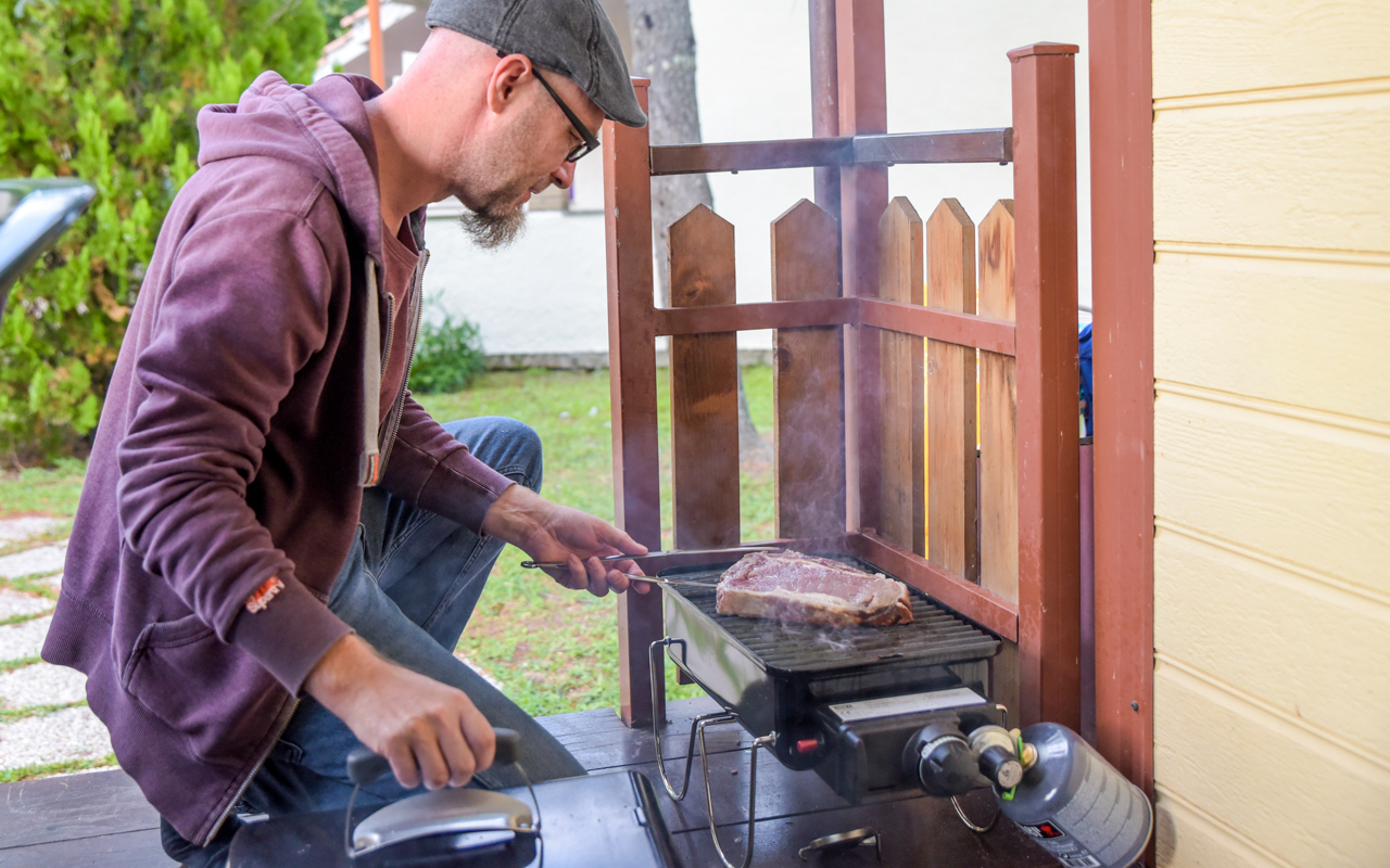 Das Bistecca besorge ich mir schon zwei Tage vorab. Nicht in einem Feinkostladen, sondern in der Fleischabteilung vom Coop. Ich war erst skeptisch, ob ich der Qualität dort trauen kann. Ein Koch, der am Campingplatz arbeitet zerstreute meine Zweifel. Dort wo auch die Einheimischen einkaufen, meinte er, passt die Qualität. Hier lässt sich niemand mit schlechter Qualität abspeisen. Ich greife also beherzt zu und lasse mir ein schönes dickes Stück herunter schneiden. Das Fleisch salze ich kräftig von beiden Seiten und lege es für die nächsten zwei Tage in den Kühlschrank.