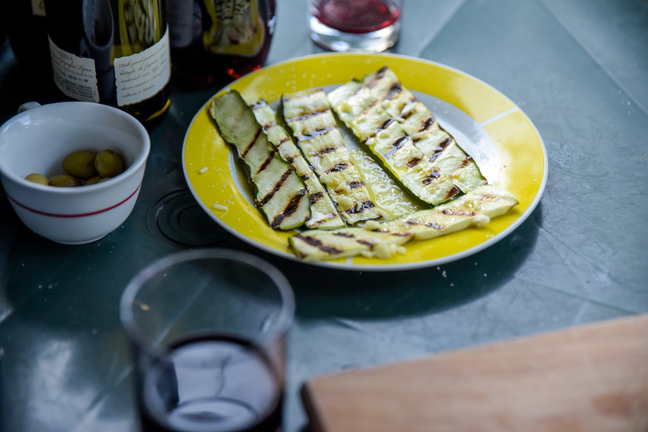 Dazu gebratene Zucchhinistreifen die ich auf dem Grill anröste und danach mit etwas Knoblauch, Salz und viel Olivenöl mariniere.