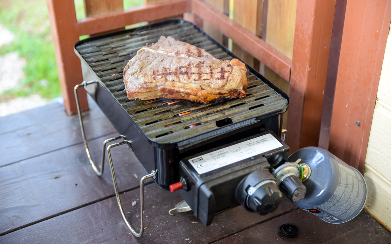 Das Praktische an einem Gasgrill ist, dass die Hitze schon kurz nach dem Anzünden zur Verfügung steht. Ich heize den Grill max. 3 – 4 Minuten vor. Bei meinem Testlauf hat er nach 5 Minuten bereits 280° C erreicht. Diese Temperatur reicht für die meisten Anwendungen völlig aus. Hervorzuheben ist, dass beim Go-Anywhere die Hitzeverteilung annähernd gleichmäßig über die komplette Fläche verteilt ist. Es gibt bei meinem Grill nur geringe Schwankungen, was ich daran erkennen kann, dass das Brot, welches ich für die Bruscetta darauf röste, an der einen Stelle ein klein wenig schneller Farbe bekommt als auf der anderen.