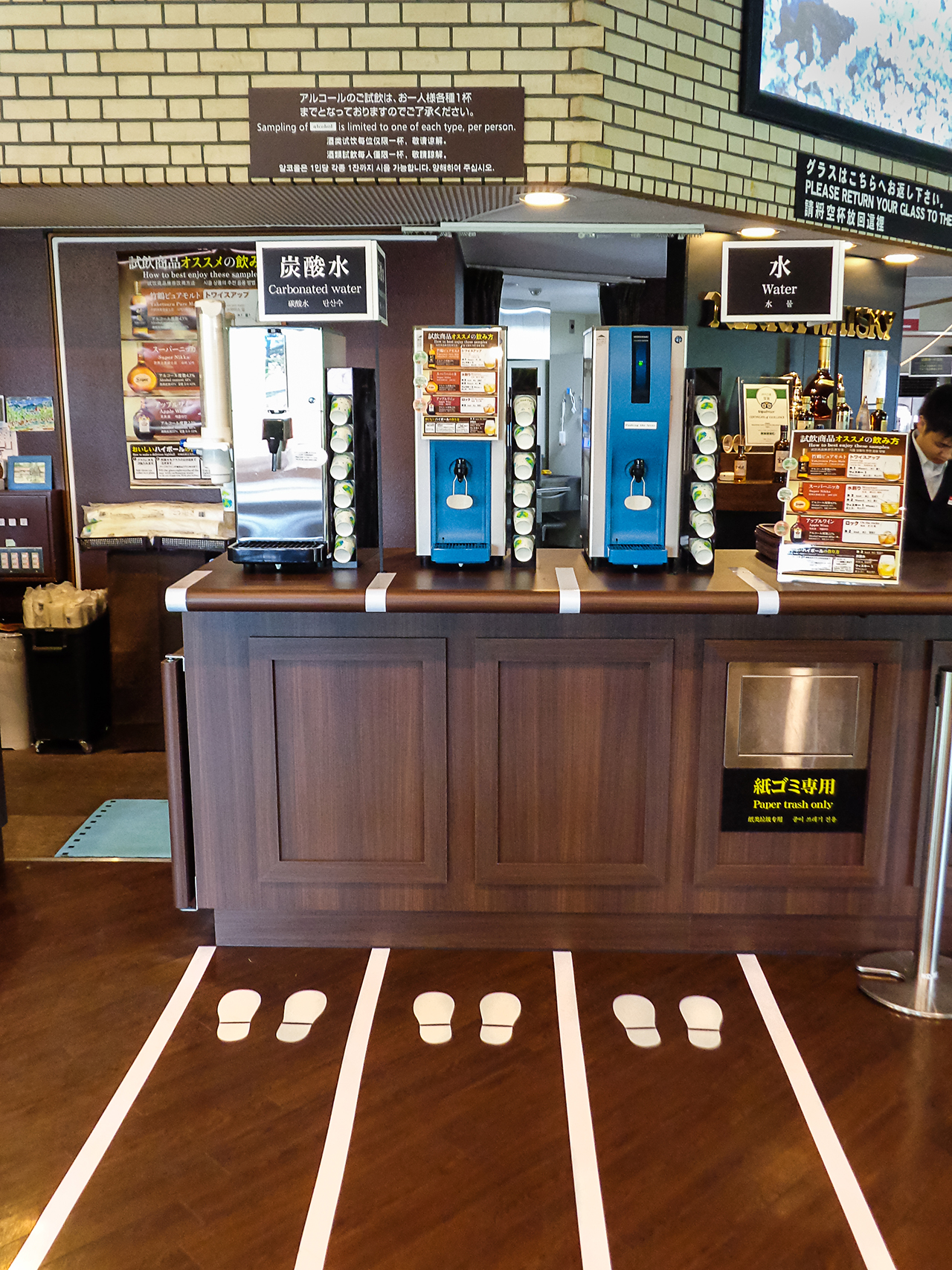 Man kann die Destillerie auf eigene Faust erkunden oder an einer der kostenlosen Führungen teilnehmen, die allerdings meist auf Japanisch gehalten werden. Betritt man den Verkostungsraum, bemerkt man gleich, dass man in Japan ist: Ganz selbstverständlich stellen sich alle schön in einer Reihe an, um ihre drei Proben abzuholen. Klassischerweise geben Japaner diesen dann Eis hinzu oder trinken den Whisky als Highball, das heißt ein Drittel Whisky und zwei Drittel Sodawasser. Bis auf die wenigen europäischen Touristen trinkt hier so gut wie niemand seinen Whisky pur.