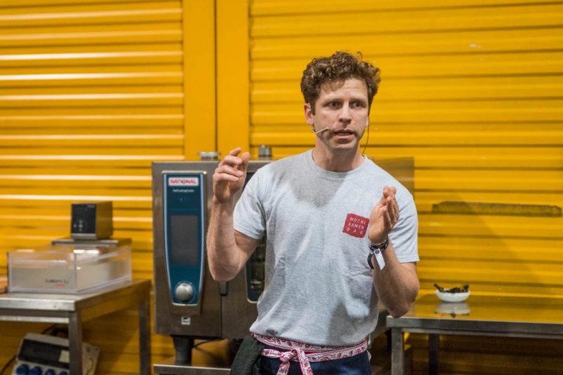 Der erste Koch der die Bühne betritt ist Tim Raue aus Berlin (2 Sterne, Nummer 3 der 50 Best Chefs Germany). Viele kennen ihn mittlerweile aus dem Fernsehen, als Gegner von Tim Mälzer in Kitchen Impossible. Auf dem Bildschirm kam er mir immer etwas arrogant und launisch vor. Jetzt steht er vor uns und begrüßt die Zuschauer überraschend locker und gut gelaunt. „Guten Morgen, wir wurden gebeten anzufangen, irgendwer muss ja Frühstück machen…„. Tim erzählt von seiner „asiatisch inspirierte Küche“ bei der nur die Perfektesten Produkte verwendet werden. Allein bei den Chilisorten haben sie über 15 verschiedene Arten in seinem Lokal. Mir wird schnell klar, hier betrete ich eine andere Welt. Das Niveau hier ist hoch.
