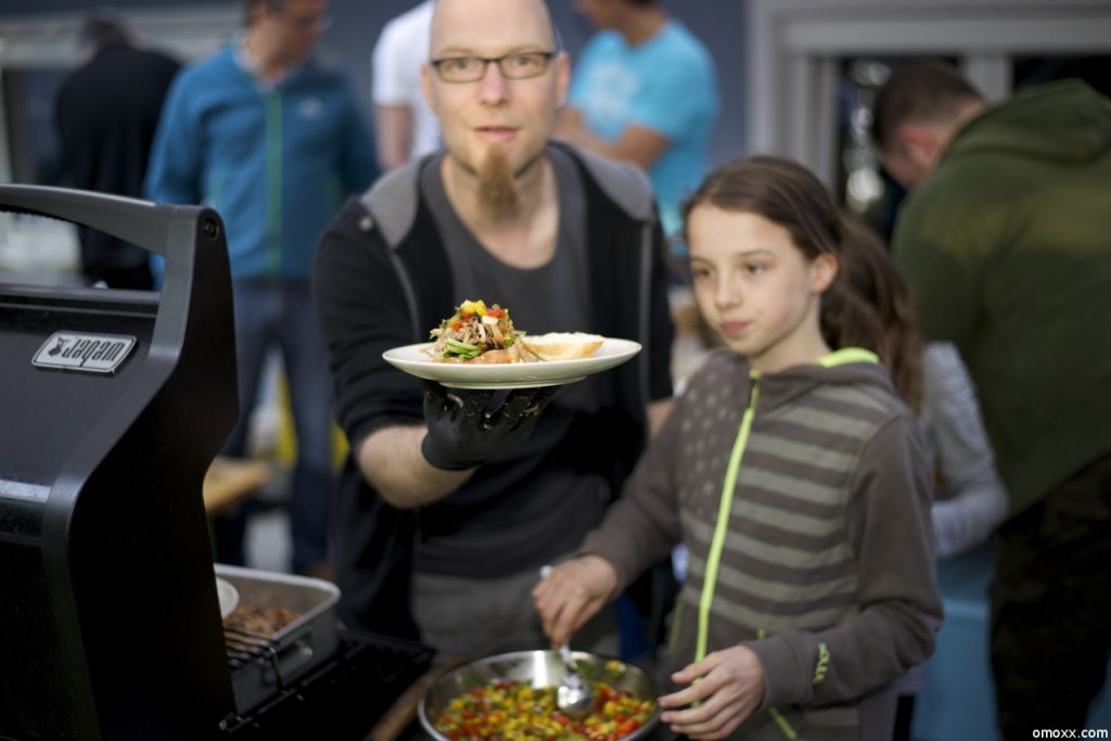 Der Anfang war noch etwas zaghaft, aber nach und nach war die Neugierde geweckt und eine Stunde später waren sämtliche Posten belegt. Jeder der wollte durfte mitmachen und so wurde bald gegrillt, geschnitten und gebraten. Die grobe Richtung habe ich vorgegeben, alles andere war spontanes ehrliches Kochen und es hat herrlich geschmeckt.