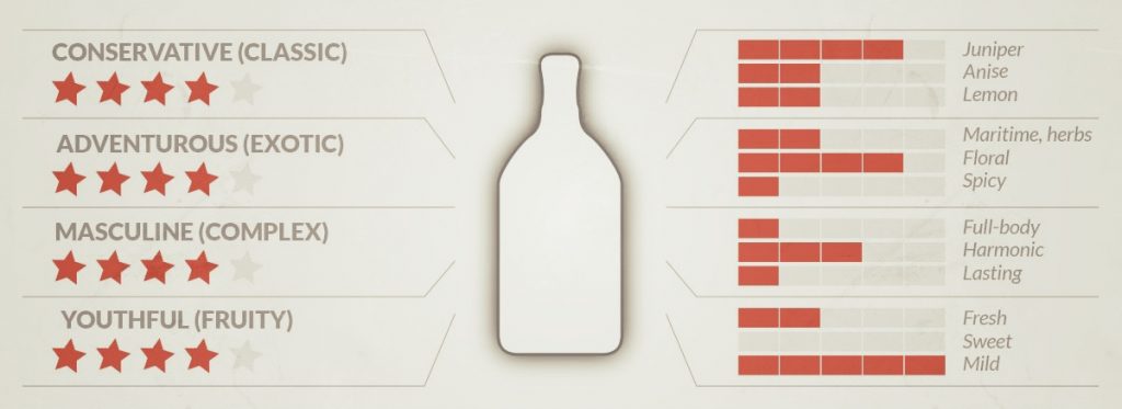 Mit Hilfe der vier Hauptkategorien (die sich aus den jeweiligen Ausprägungen der 12 Subkategorien ergeben) soll ein Gin grundsätzlich charakterisiert werden.