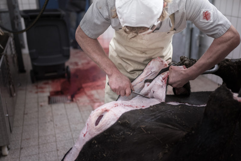 Der Metzger prüft die Reflexe. Es muss absolut sicher gestellt sein, dass das Tier besinnungslos ist. Nur dann ist eine schmerzfrei Tötung gewährleistet.