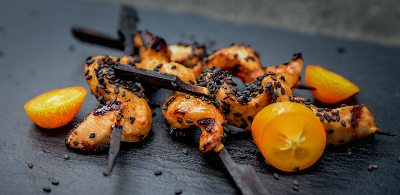 Glasierte Hühnerspieße mit schwarzem Sesam