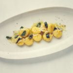 7. Die Kartoffelnocken in reichlich kochendem Salzwasser geben und einmal kräftig aufkochen lassen. Sobald die Gnocchis an der Oberfläche schwimmen die Temperatur zurückschalten und noch 2 Minuten ziehen lassen. Mit einer Schaumkelle die Gnocchis aus dem Wasser nehmen und sofort in eine große Pfanne mit Salbeibutter geben und darin schwenken.