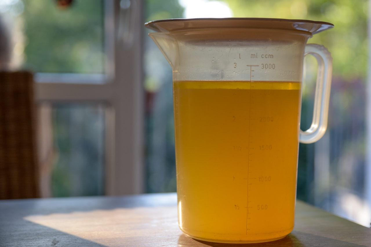 - Am nächsten Tag hat sich eine feste weiße Fettschicht gebildet. Diese vorsichtig abnehmen und zur Seite stellen. Dieses Fett nicht wegwerfen das kann man noch prima zum kochen und braten verwenden (z.B. für Bratkartoffeln).
