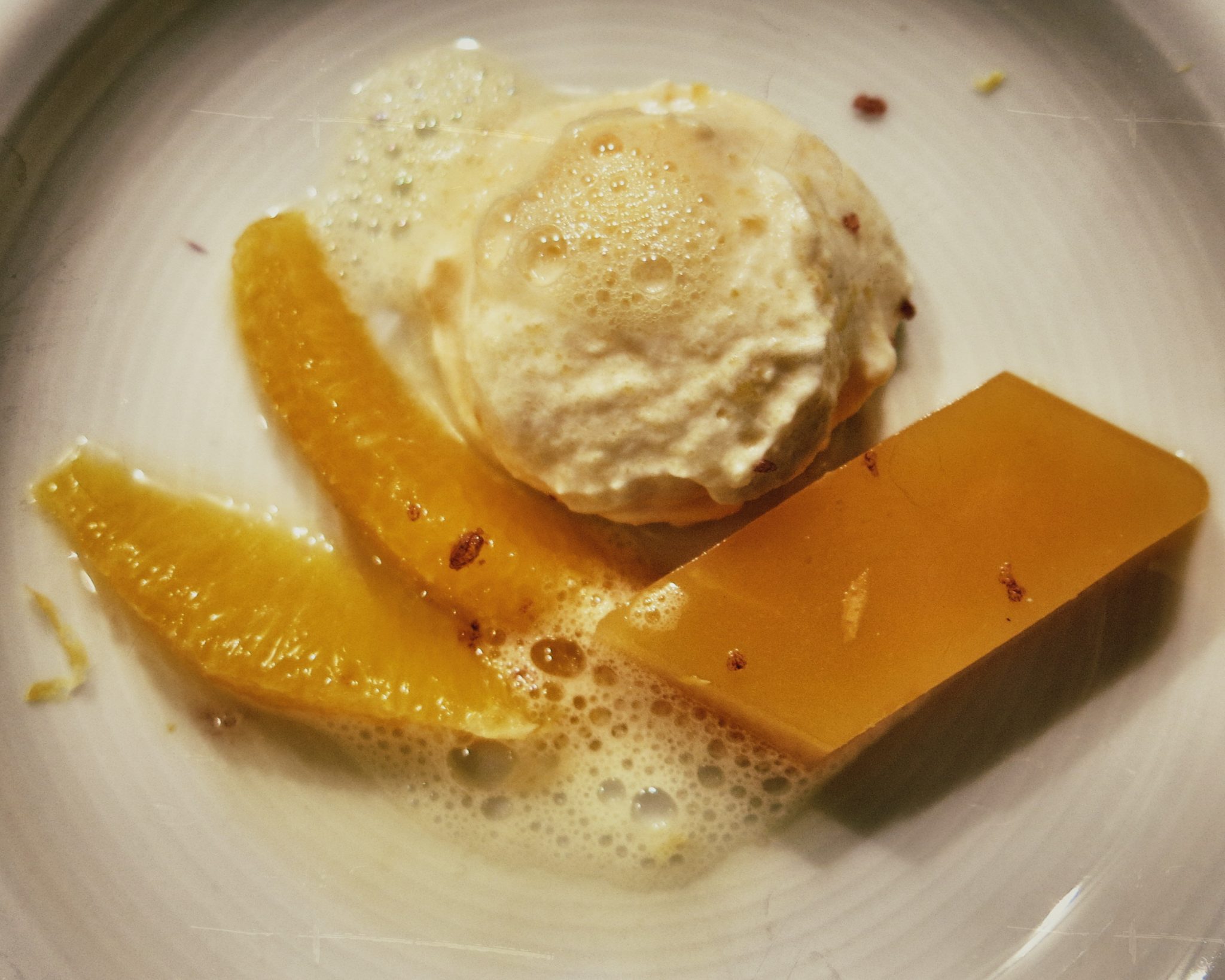 IMG_5323_SnapseedZum Anrichten eine kleine Kugel Mousse in die Mitte des Tellers geben. Das Gelee in Rauten schneiden und je eine Raute zu dem Mouse geben. 1-2 Spalten der marinierten Orangenfilets dazu legen und 2 EL von dem Orangenschaum über das Mousse und das Gelee verteilen.